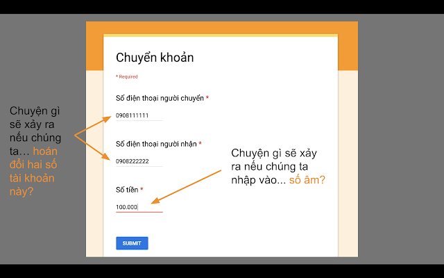 Hình ở trên là một slide trong bài nói chuyện của tôi. Đây là một buổi giảng dạy về an ninh mạng, nên tôi dùng form này để hướng dẫn cho khách tham dự cách suy nghĩ như một hacker. Tôi thấy đây là một cách tiếp cận hiệu quả, mà không cần phải đi sâu vào các chi tiết kỹ thuật, bởi vì không phải ai nhìn vào ô số tiền cũng có thể nghĩ ngay đến "àh, tôi sẽ nhập vào số âm".